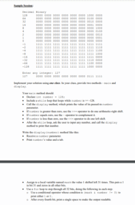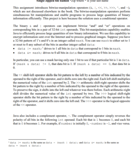 This assignment introduces bitwise-manipulation operators (&, |, <<, >>, >>>, ^, and ~), which are not discussed elsewhere in the book. The bitwise-manipulation operators perform simultaneous bit manipulations and enable programs to process large quantities of binary information efficiently. This project is here because the solution uses a conditional operator.