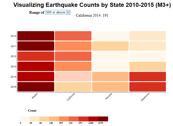 • The vertical axis represents states in a region. The state names should be sorted in ascending order on the vertical axis where the state with the lowest amount of earthquakes is at the bottom and the state with the highest order of earthquakes is at the top.